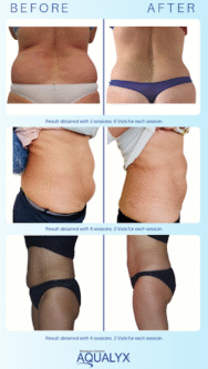 Noticeable change within 2 weeks is visible and with the best results already apparent after 6 to 12 weeks. Results of an Aqualyx treatment are permanent under the condition of maintaining a constant weight with a continued controlled diet and exercise regimen. Permanent results are guaranteed since once the fat tissues are broken down, the free fatty acids are processed through the body’s lymphatic system and don’t reappear.