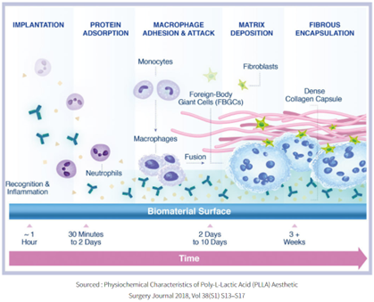 The origin of PLLA dates back to 1932, when Carothers, an American chemist at DuPont, heated lactic acid, creating low molecular weight products. PLLA microspheres are carefully calibrated to a diameter of 40 to 63 µm. It stimulates fibroblasts to produce collagen; then, the newly generated collagen fills in the volume loss of the skin deep within the dermal and subcutaneous layer. It is one of the most durable biomaterials used in dissolvable stitches. This indicates the strength of PLLA as a powerful anti-aging treatment, maintaining the skin’s barrier without causing harmful side effects as it naturally degrades from the body by breaking down into water and carbon dioxide as a by-product, excreting through respiration or bodily fluids (sweat and urine).